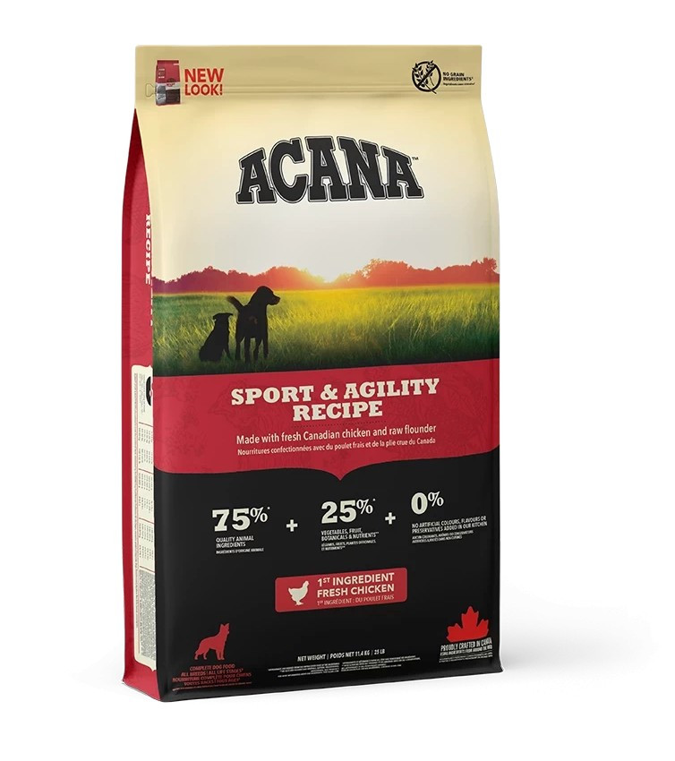 A háziasított kutyát a természet a húsalapú táplálék feldolgozására tervezte. Ezért az ACANA Sport & Agility gyártása során felhasznált alapanyagok 75 százaléka hús: szabadon tartott csirke, vadon fogott lepényhal és mélyalmos tojás. A környék farmjain tenyésztett szárnyasok, a Csendes-óceánból fogott halak és a tojás emberi fogyasztásra alkalmasak.