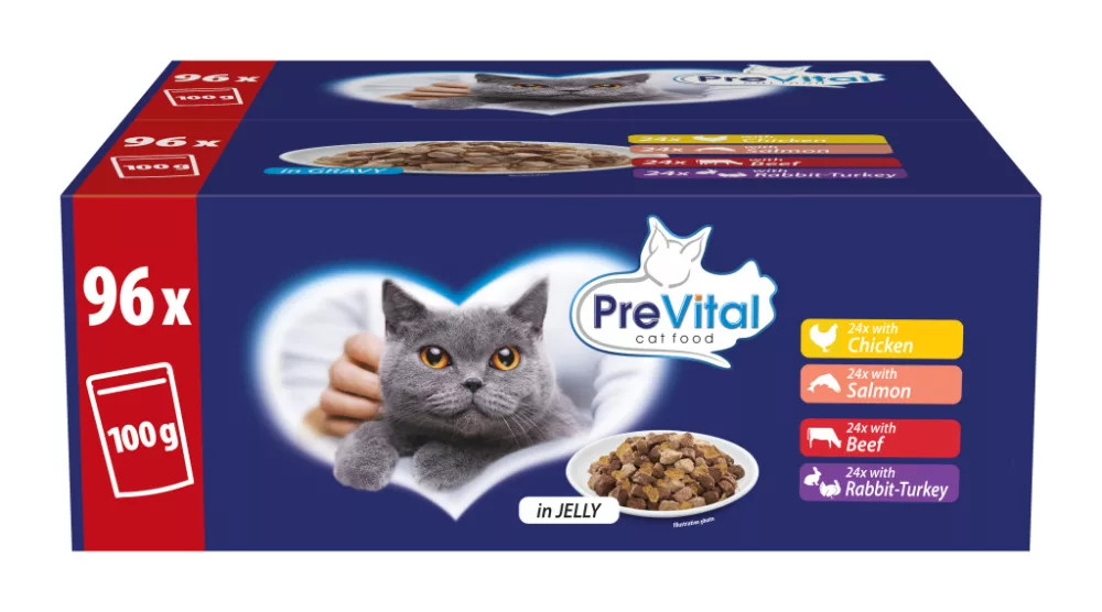 Válaszd a Prevital cicakajákat: teljeskörű gondoskodás az elégedett dorombolásért.A PreVital termékcsaládot úgy alkottuk meg, hogy a kölyökcicától az idősebb korúig, minden életkorban 100%-ban teljes értékű és kiegyensúlyozott macskatáppal táplálhassuk házi kedvenceinket, legyen szó akár száraz, akár nedves macskaeledelről. Minden PreVital macskatáp tartalmazza a szükséges vitaminokat és ásványi anyagokat, így a cicák mindennapjai kiegyensúlyozottabbak és boldogabbak lesznek.Alutasakos macskakaját keresel? A PreVital standard alutasakos nedves macskaeledel ízletes, tápláló és remek választás, amennyiben teljes értékű nedves eledelt keresel felnőtt cicád számára.Válaszd ezt az alutasakos, nedves macskatápot a könnyű és kiszámolható adagolásért!Ez a macskatáp kiszerelés 4 ízt tartalmaz:24x100g csirkével szószban,24x100g lazaccal szószban,24x100g marhával aszpikban,24x100g nyúllal és pulykával aszpikban.A cicák egészségéért minden ízű alutasakos nedvestáp D3- és E-vitamint tartalmaz. Lepd meg a cicád kiváló minőségű PreVital nedves macskaeledellel! A Prevital standard alutasakos macskatáp lehet a megfelelő nedves macskaeledel kiskedvenced számára.Termékjellemző:Nagy kiszerelésű nedves macskaeledelTeljes értékű és kiegyensúlyozott macskatáp felnőtt macskáknakNedves macskatáp, amely minden szükséges vitamint és ásványi anyagot tartalmazAlutasakos macskakaja a könnyű és kiszámolható adagolásértNedvestáp a cicák hidratálásértAlutasakos cicakaja, ízletes és tápláló nedves eledelÖsszetevők:Szószban:Csirkével szószban összetétel: hús és állati származékok (4% csirke), hal és halszármazékok, növényi eredetű származékok, növényi fehérje kivonatok, ásványi anyagok, különféle cukrok. Tartósítószer nélkül.Lazaccal szószban összetétel: hús és állati származékok, hal és halszármazékok (4% lazac), növényi eredetű származékok, növényi fehérje kivonatok, ásványi anyagok, különféle cukrok. Tartósítószer nélkül.Analitikai összetevők: Nedvességtartalom 82%, Nyersfehérje 9%, Zsírtartalom 5%, Nyershamu 3%, Nyersrostok 0,8%.Adalékanyagok: Tápértékkel rendelkező adalékanyagok/ kg: D3-vitamin 160 NE*, E-vitamin 30 mg, Cink (mint Cink szulfát-monohidrát) 10 mg, Mangán (mint Mangán(II) oxid) 2 mg, Réz (mint Réz(II) szulfát-pentahidrát) 1,2 mg, Jód (mint Kalcium-jodát, vízmentes) 0,2 mg, Taurin 520 mg. *NE = Nemzetközi egység.Etetési útmutató: Az etetési útmutató csak irányelvként szolgál. Egy átlagos, 3-6 kg testtömegű macska napi adagja 265-420 g, lehetőleg 2 vagy több adagra osztva. Szobahőmérsékleten tálalja. Felbontás után max 2 napig hűtőben tárolható.Aszpikban:Marhával aszpikban összetétel: hús és állati származékok (4% marha), gabonafélék, növényi fehérje kivonatok, ásványi anyagok, különféle cukrok. Színezékek és tartósítószer nélkül.Nyúllal és pulykával aszpikban összetétel: hús és állati származékok (4% nyúl, 4% pulyka), gabonafélék, növényi fehérje kivonatok, ásványi anyagok, különféle cukrok. Színezékek és tartósítószer nélkül.Analitikai összetevők: Nedvességtartalom 82%, Nyersfehérje 7%, Zsírtartalom 4,5%, Nyershamu 2,5%, Nyersrostok 0,3%.Adalékanyagok: Tápértékkel rendelkező adalékanyagok/ kg: A-vitamin 1100 NE*, D3-vitamin 100 NE*, E-vitamin 15 mg, Cink (mint Cink szulfát-monohidrát) 10 mg, Mangán (mint Mangán(II) oxid) 2,5 mg, Réz (mint Réz(II) szulfát-pentahidrát) 1,2 mg, Jód (mint Kalcium-jodát, vízmentes) 0,2 mg, Taurin 520 mg. *NE = Nemzetközi egység.Etetési útmutató: Az etetési útmutató csak irányelvként szolgál. Egy átlagos, 3-6 kg testtömegű macska napi adagja 260-415 g, lehetőleg 2 vagy több adagra osztva. Szobahőmérsékleten tálalja. Felbontás után max 2 napig hűtőben tárolható.